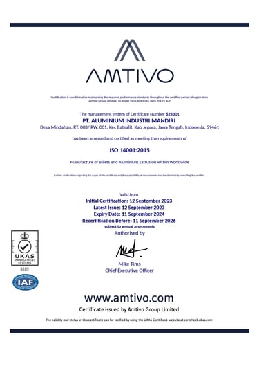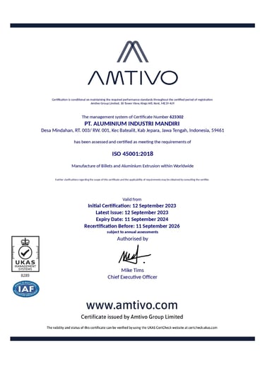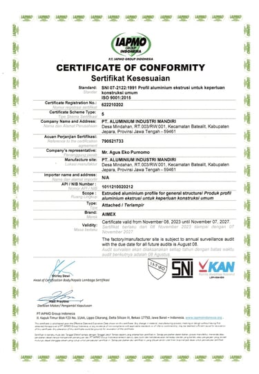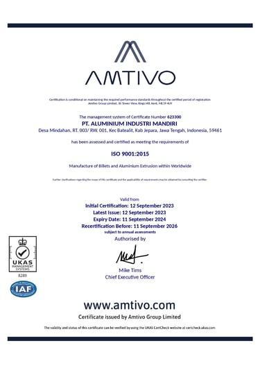 PT Aluminium Industri Mandiri memiliki kapasitas produksi sampai dengan 800 ton per bulan. Dengan sistem produksi satu pintu, memberikan keyakinan kepada PT Aluminium Industri Mandiri untuk memberikan kualitas terbaik pada produk yang diciptakan, ketepatan waktu pengiriman juga menjadi pertimbangan demi memberikan kepuasan pelanggan.